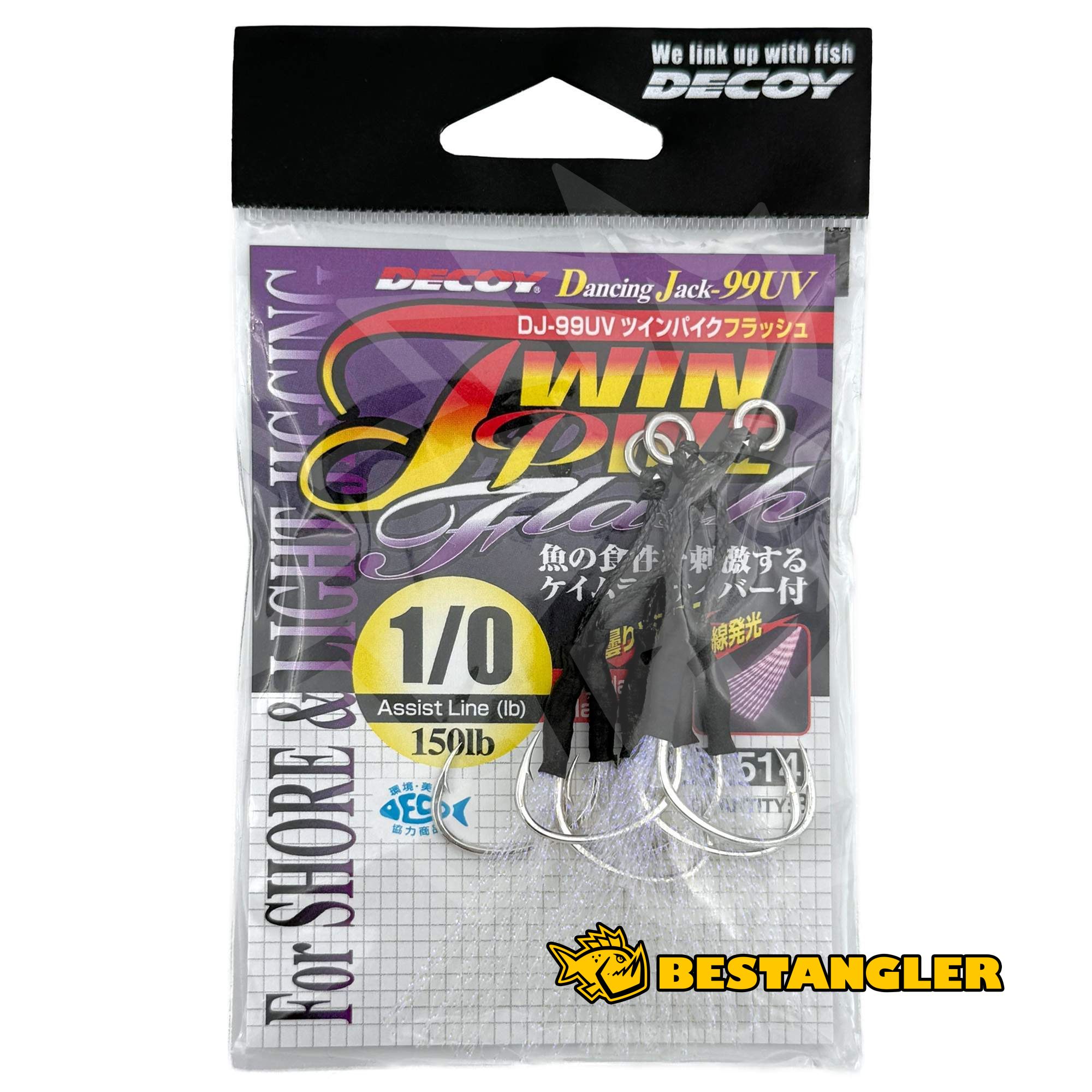 DECOY DJ-99UV Twin Pike Flash is a modern variation of the proven assist hook DJ-88 Twin Pike, enhanced with UV (Keimura) flash fibers that increase the overall attractiveness of the rig. The fine fibers react to the UV spectrum of light, producing a subtle flash while maintaining a natural appearance—exactly what predatory fish demand when feeding cautiously.