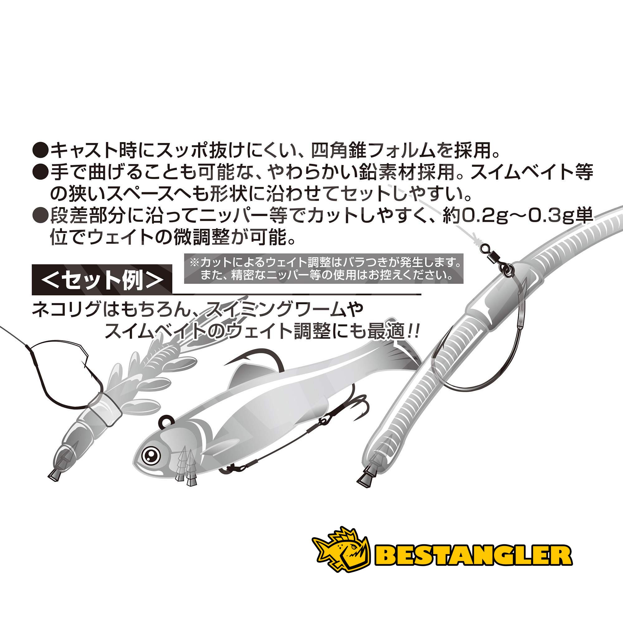 The weight can be easily shortened segment by segment, allowing very precise adjustments of roughly 0.2–0.3 g at a time. The high-density material can be cut or lightly shaped by bending. A great component for anglers who need to precisely adapt the behaviour of their lure to current conditions.
