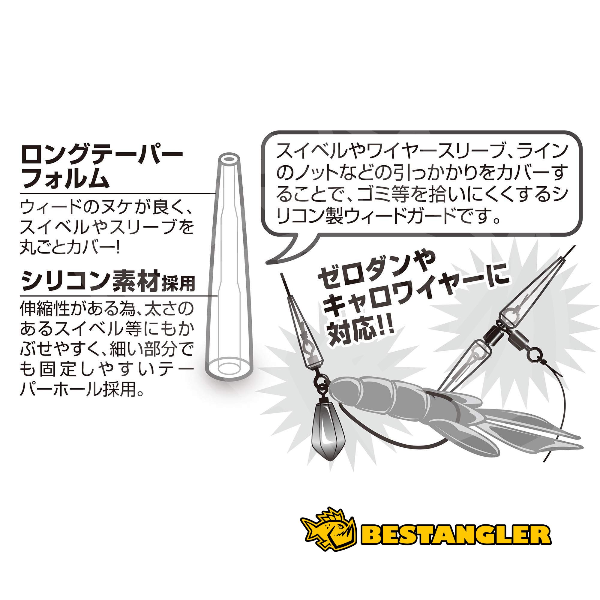 DECOY L-10 Long iGuard is a tapered silicone tube that serves to protect the rig from snagging in aquatic vegetation. It is slid directly over swivels, wire crimps, or knots, creating a smooth transition and significantly minimizing debris accumulation. The flexible material and variable inner diameter ensure easy sliding over bulkier components, while the narrower end firmly secures the connection even on very thin monofilament or braided lines. The elongated shape reliably covers the entire swivel, and the transparent design does not interfere with the natural presentation of the lure.