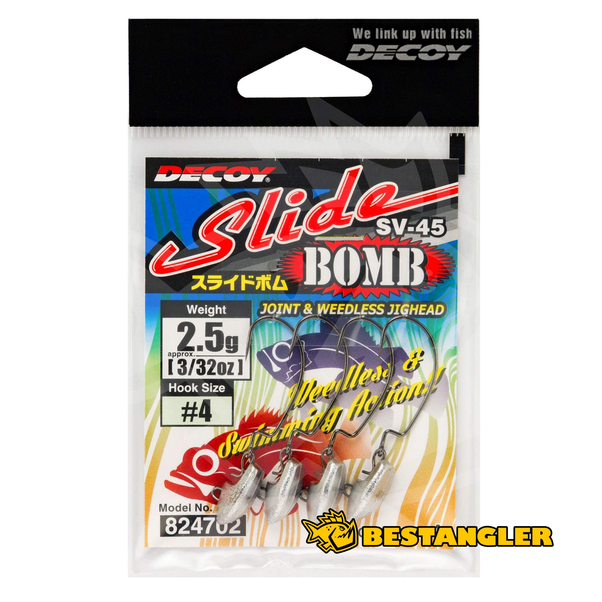The articulated jig head DECOY SV-45 Slide Bomb is designed for fishing in heavily weeded areas and snags. Unlike standard fixed heads, it features a swinging hook connection, which gives the soft plastic bait maximum freedom of movement and a more pronounced action. The specifically shaped weight combines bottom stability with the ability to smoothly slip through obstacles. The connecting eye acts as a clip, allowing the hook to be quickly swapped for a different size or shape as needed. From the factory, the system is rigged with a strong offset hook Worm 17 Kg Hook.