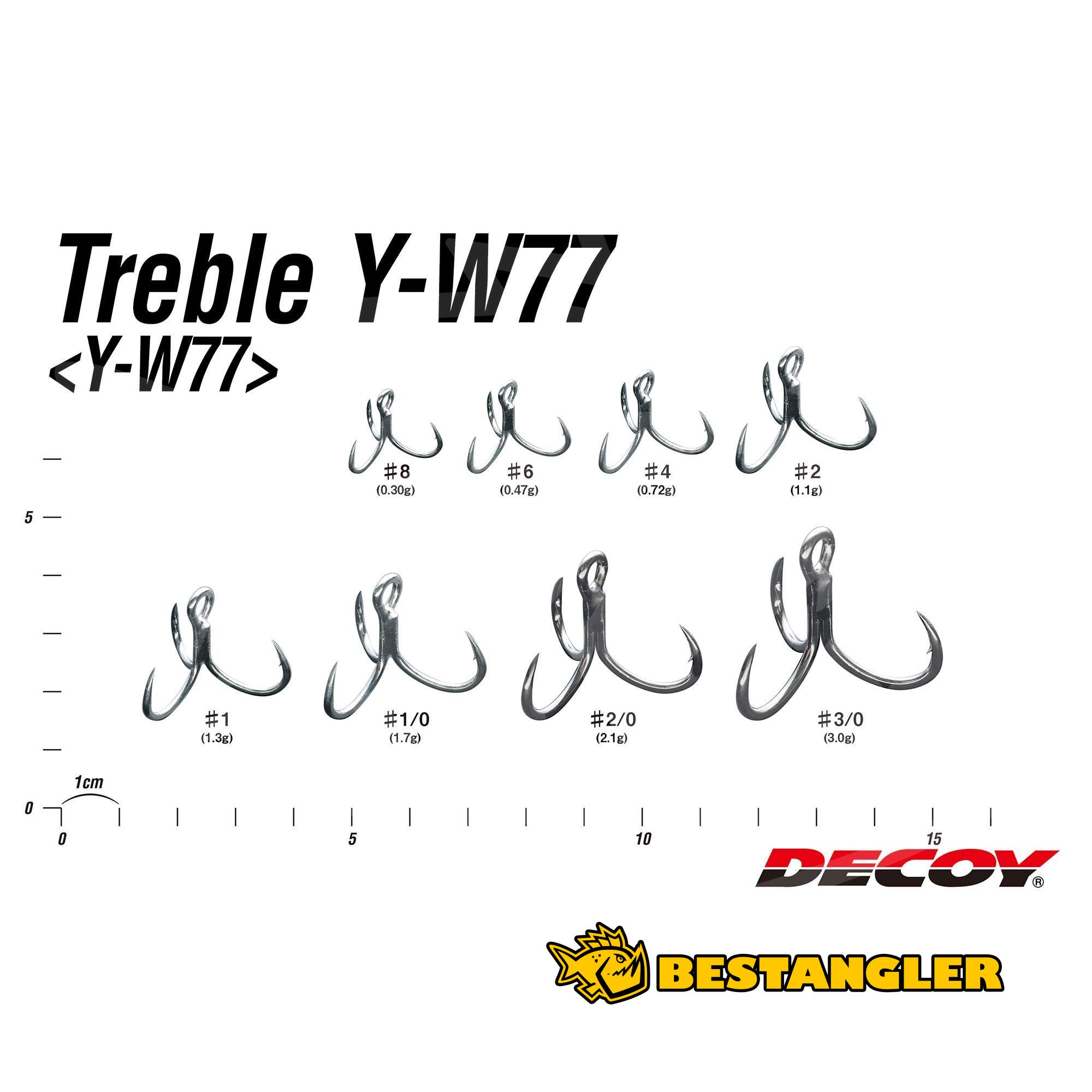 DECOY Treble Y-W77 is a heavy-duty treble hook designed for demanding saltwater spinning and targeting large predators. The construction features an EX wide gape bend combined with a very short shank, allowing a large gap to be maintained within a compact overall hook length. This provides a larger effective hooking area when rigged on a hardbait or other lure, without negatively affecting its action.