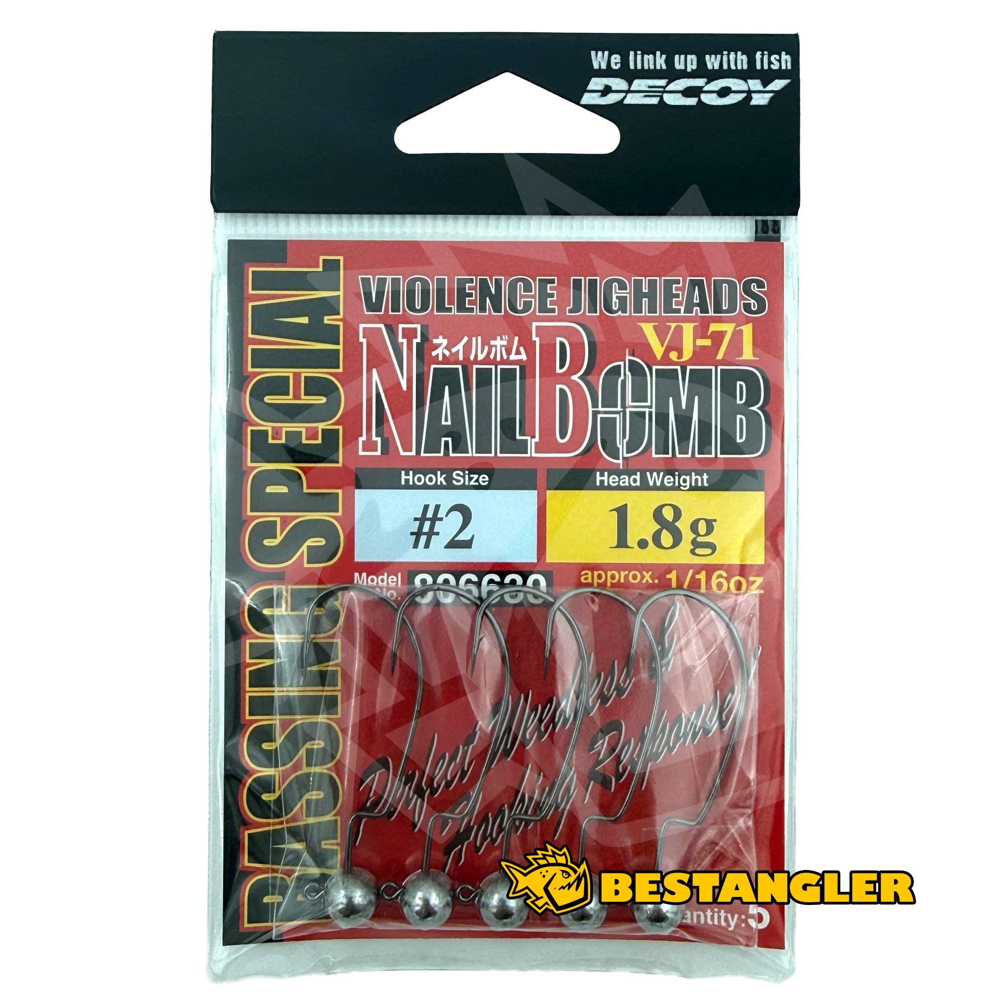 DECOY VJ-71 Nail Bomb is a legendary offset-style jig head that combines outstanding weedless performance with crisp, reliable hook-setting response. The specially shaped offset hook provides clean bait presentation, minimizes snagging in vegetation or structure, and ensures the lure tracks naturally. The precisely balanced head allows the bait to maintain a subtle rolling action during steady retrieves, while even light twitches trigger a sharper, more lifelike movement.