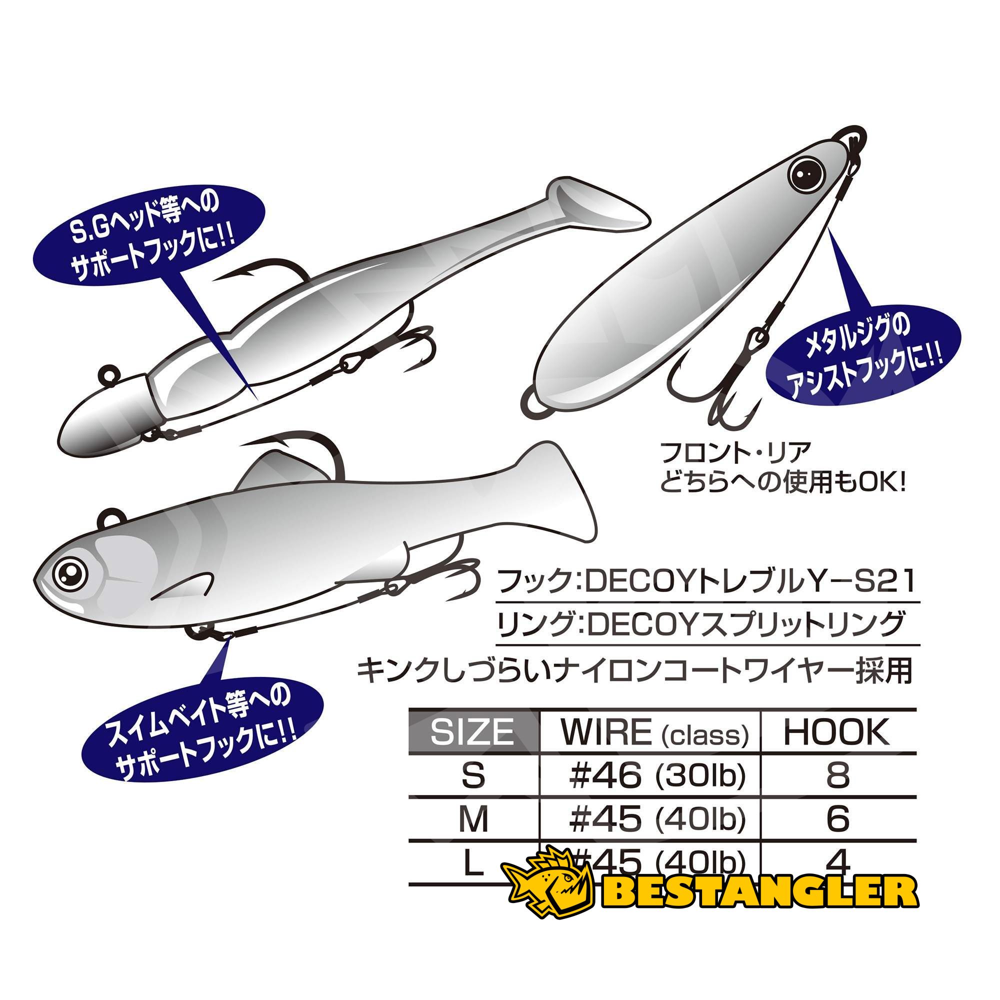 Drát je vyroben z 3×7 ocelového lanka s nylonovým potahem, které je odolné proti zalomení a zároveň dostatečně flexibilní při zdolávání. Spoje jsou pevně zajištěny pomocí dvojitých krimpovacích objímek a montáž je doplněna o dělený kroužek DECOY pro snadné připojení k nástraze nebo jigové hlavě. WA-21 lze použít jako přední i zadní asist při jiggingu, jako doplňkový háček k jigovým hlavám nebo jako pojistný háček při lovu dravců s ostrými zuby, například při lovu štik, mořských dravců nebo dalších silných predátorů.