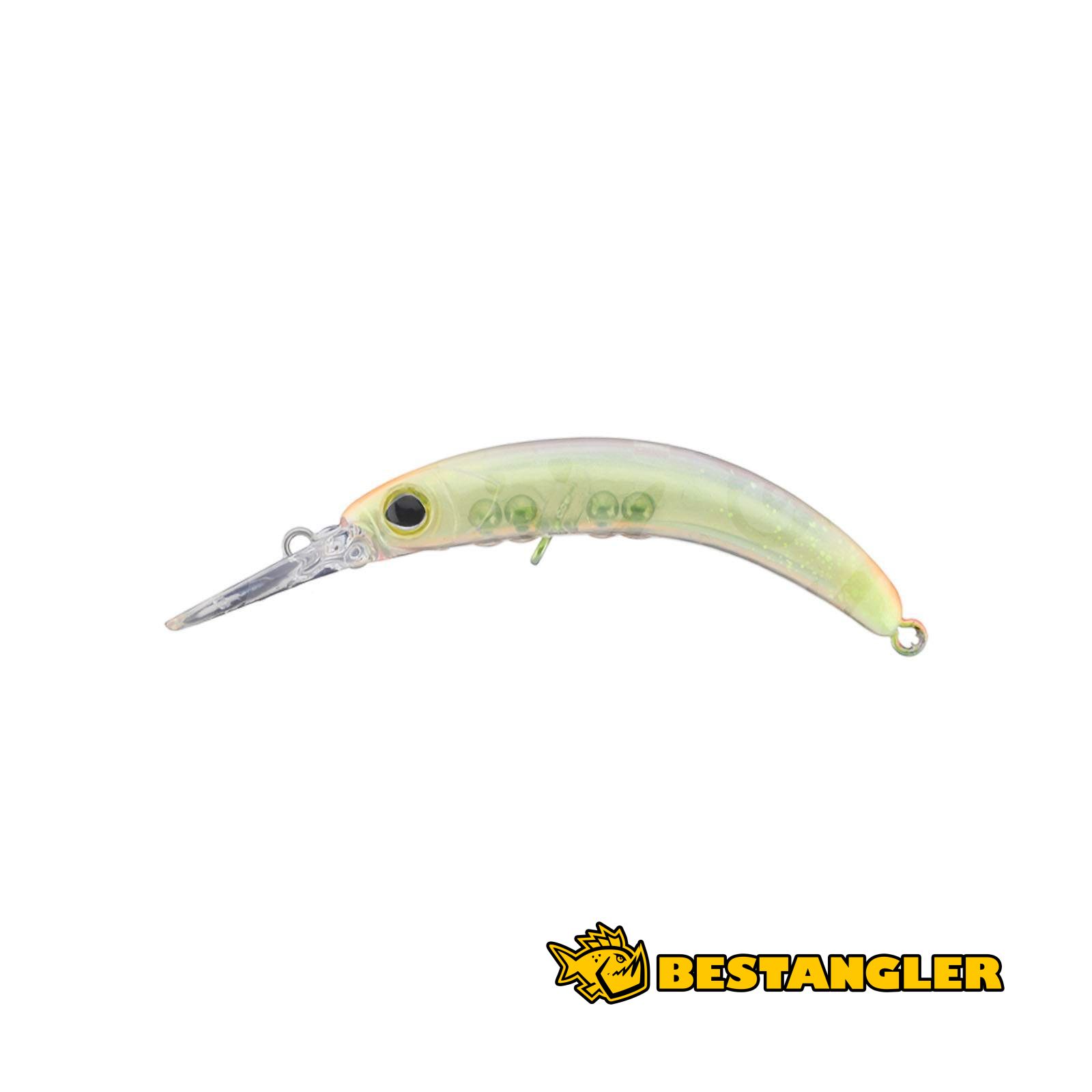 The compact crankbait Jackall Timon Chibi Pepino MR features a reduced slim profile specifically designed for fishing heavily pressured waters. The body construction utilizes a protruding weight chamber equipped with four steel balls. This arrangement radically lowers the lure's center of gravity and guarantees a highly stable action even during an extremely slow retrieve. Similarly curved lures tend to rotate during the cast, but the purposely shaped slim lip effectively minimizes aerodynamic drag and gives the wobbler very accurate flight characteristics.